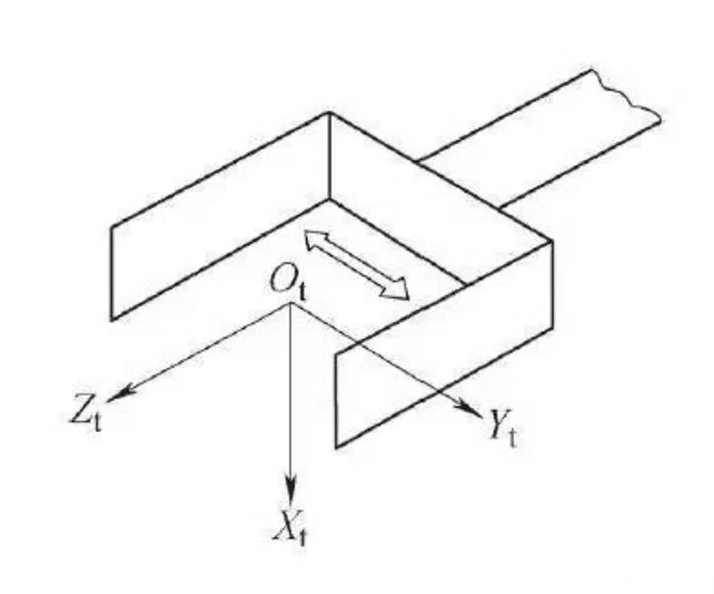 工具坐標(biāo)系以安裝在機(jī)械接口上的末端執(zhí)行器為參照系,符號為O t、X t、Y t、Z t(見下圖)。原點(diǎn)O t是工具中心點(diǎn)(TCP);+Zt軸與工具有關(guān),通常是工具指向;在平板式夾爪型夾持器夾持時(shí),+Y t是手指運(yùn)動平面的方向。