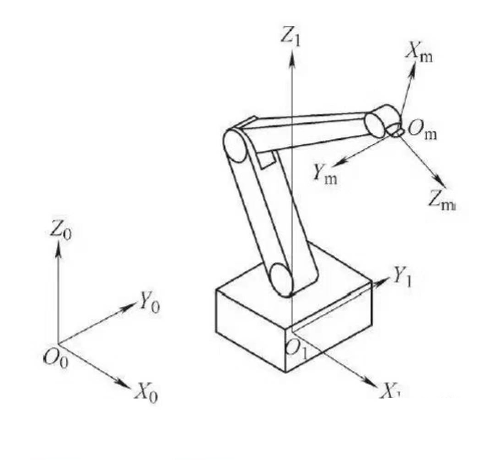 機(jī)械接口坐標(biāo)系是以機(jī)械接口為參照系,符號為O m、X m、Y m、Z m(見上圖右)。原點(diǎn)O m是機(jī)械接口的中心;+Z m軸的方向垂直于機(jī)械接口中心,并由此指向末端執(zhí)行器;+X m軸由機(jī)械接口平面和X 1、Z 1平面的交線來定義,同時(shí)機(jī)器人的主、副關(guān)節(jié)軸處于運(yùn)動范圍的中間位置。當(dāng)機(jī)器人構(gòu)造不能實(shí)現(xiàn)此約定時(shí),應(yīng)由制造廠規(guī)定主關(guān)節(jié)軸位置。+X m軸的指向遠(yuǎn)離Z 1軸。