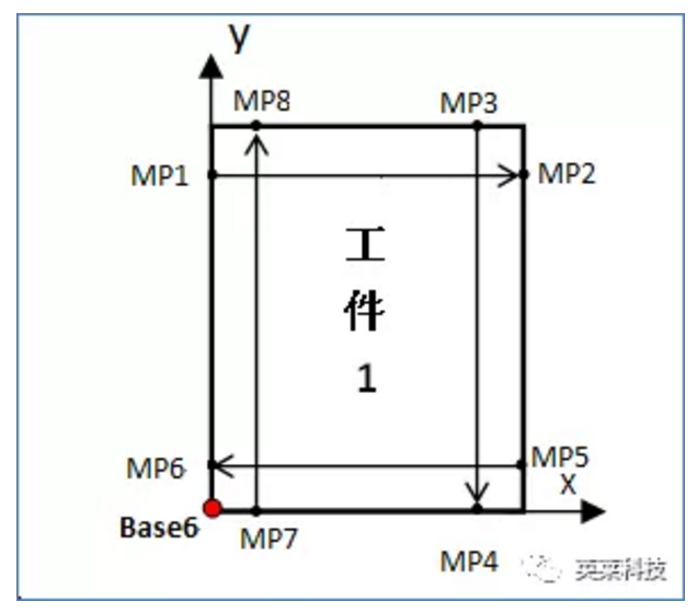 將工件1作為KUKA機(jī)器人的一個Base,測試過程中工件1用BASE[6]進(jìn)行了表示。故,以左圖中箭頭方向為序,從MP1開始,到MP8點數(shù)據(jù)均可得到。下一步只需求得工件1在機(jī)器人坐標(biāo)系下的位姿(也即base_data[6])數(shù)據(jù)即可。