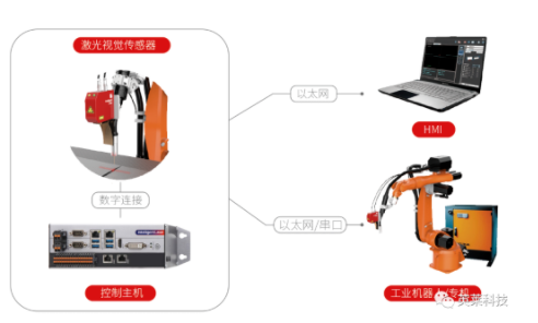 激光視覺焊縫跟蹤系統(tǒng)由焊縫跟蹤傳感器及控制主機組成,傳感器負責焊縫信息的主動采集,控制主機負責焊縫信息的實時處理,并與工業(yè)機器人或焊接專機保持實時通訊,讓工業(yè)機器人或焊接專機實現(xiàn)焊縫尋位、焊縫實時跟蹤的功能,識別焊縫偏移矯正焊接軌跡,實現(xiàn)真正的智能化焊接。