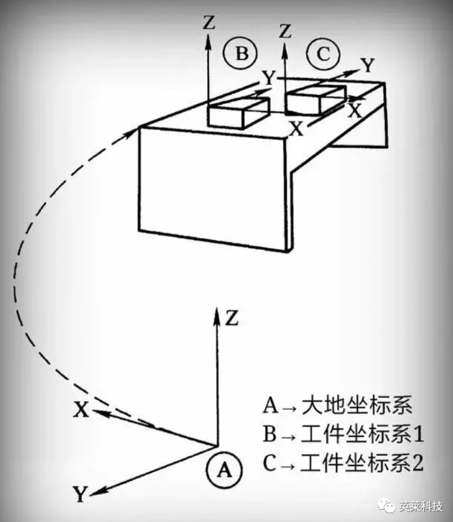 工件坐標系:它定義工件相對于大地坐標系(或其他坐標系)的位置,如下圖所示。