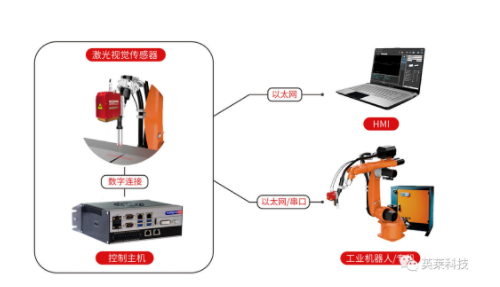 英萊激光視覺焊縫跟蹤系統(tǒng),可配套多種機器人即插即用,位于焊槍前端的傳感器可主動采集焊縫信息,控制主機負(fù)責(zé)焊縫信息的實時處理,并與工業(yè)機器人或焊接專機保持實時通訊,實現(xiàn)焊縫特征點尋位糾偏、焊縫實時跟蹤的功能,根據(jù)實際情況矯正焊接軌跡。